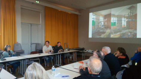 Sylvain Morvant, architecte et maître d’œuvre du projet, a pris le relai. Il a fait une présentation des travaux réalisés : accessibilité des personnes à mobilité réduite, remises aux normes incendie, électricité, matériaux utilisés (terre/chanvre, ouate, etc).